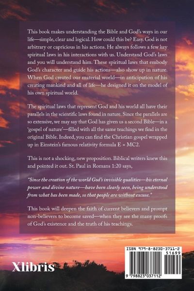This book makes understanding the Bible and God's ways in our life-simple, clear and logical. How could this be? Easy. God is not arbitrary or capricious in his actions. He always follows a few key spiritual laws in his interactions with us. Understand God's laws and you will understand him. These spiritual laws that embody God's character and guide his actions-also show up in nature. When God created our material world-in anticipation of his creating mankind and all of life-he designed it on the model of his own spiritual world. The spiritual laws that represent God and his world all have their parallels in the scientific laws found in nature. Since the parallels are so extensive, we may say that God has given us a second Bible-in a 'gospel of nature'-filled with all the same teachings we find in the original Bible. Indeed, you can find the Christian gospel wrapped up in Einstein's famous relativity formula E = MC2. This is not a shocking, new proposition. Biblical writers knew this and pointed it out. St. Paul in Romans 1:20 says, "Since the creation of the world God's invisible qualities-his eternal power and divine nature-have been clearly seen, being understood from what has been made, so that people are without excuse." This book will deepen the faith of current believers and prompt non-believers to become saved-when they see the many proofs of God's existence and the truth of his teachings.