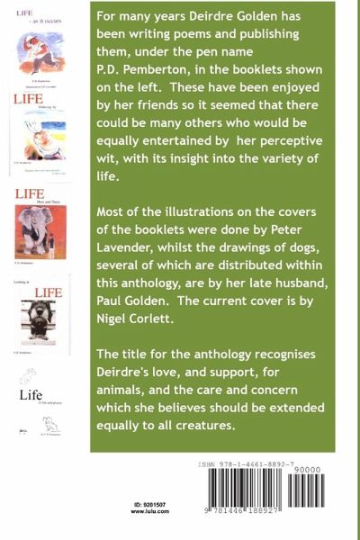 For many years Deirdre Golden has been writing poems and publishing them in booklets, under the pen name P.D.Pemberton. These have been enjoyed by her friends so it seemed that there could be many others who would be equally entertained by her perceptive wit, with its insights into the variety of life. Most of the illustrations on the covers of the booklets were done by Peter Lavender, whilst the drawings of dogs, several of which are distributed within this Anthology, are by her late husband, Paul Golden. The current cover is by Nigel Corlett. The title for the Anthology recognises Deirdre's love, and support, for animals, and the care and concern which she believes should be extended equally to all creatures.