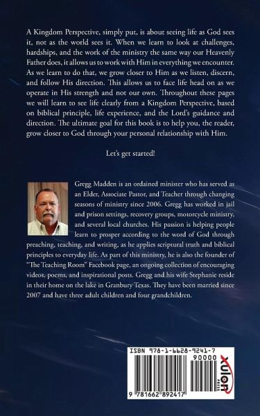 A Kingdom Perspective, simply put, is about seeing life as God sees it, not as the world sees it. When we learn to look at challenges, hardships, and the work of the ministry the same way our Heavenly Father does, it allows us to work with Him in everything we encounter. As we learn to do that, we grow closer to Him as we listen, discern, and follow His direction. This allows us to face life head on as we operate in His strength and not our own. Throughout these pages we will learn to see life clearly from a Kingdom Perspective, based on biblical principle, life experience, and the Lord's guidance and direction. The ultimate goal for this book is to help you, the reader, grow closer to God through your personal relationship with Him. Let's get started! Gregg Madden is an ordained minister who has served as an Elder, Associate Pastor, and Teacher through changing seasons of ministry since 2006. Gregg has worked in jail and prison settings, recovery groups, motorcycle ministry, and several local churches. His passion is helping people learn to prosper according to the word of God through preaching, teaching, and writing, as he applies scriptural truth and biblical principles to everyday life. As part of this ministry, he is also the founder of "The Teaching Room" Facebook page, an ongoing collection of encouraging videos, poems, and inspirational posts. Gregg and his wife Stephanie reside in their home on the lake in Granbury Texas. They have been married since 2007 and have three adult children and four grandchildren.