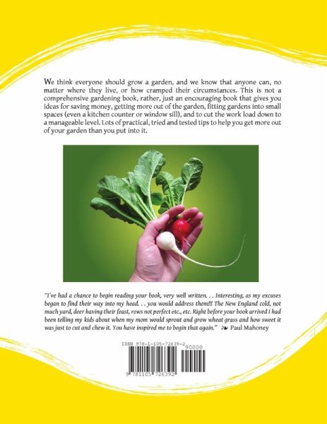 Grow a garden even where you think you can't. A quick and easy gardening book with tips for saving time, money, and energy in the garden. You can have a thriving crop of fresh food, all year, no matter where you live. Printed with generous sidebar areas for adding your own ideas and notes on results from your garden.