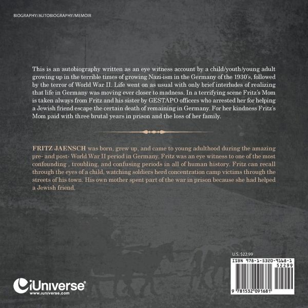 This is an autobiography written as an eye witness account by a child/youth/young adult growing up in the terrible times of growing Nazi-ism in the Germany of the 1930's, followed by the terror of World War II. Life went on as usual with only brief interludes of realizing that life in Germany was moving ever closer to madness. In a terrifying scene Fritz's Mom is taken always from Fritz and his sister by GESTAPO officers who arrested her for helping a Jewish friend escape the certain death of remaining in Germany. For her kindness Fritz's Mom paid with three brutal years in prison and the loss of her family.