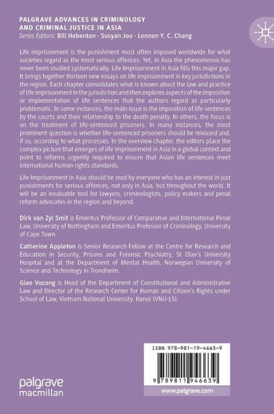 Dirk van Zyl Smit is Emeritus Professor of Comparative and International Penal Law, University of Nottingham and Emeritus Professor of Criminology, University of Cape Town. Catherine Appleton is Senior Research Fellow at the Centre for Research and Education in Security, Prisons and Forensic Psychiatry, St Olav's Hospital and at the Department of Mental Health, Norwegian University of Science and Technology in Trondheim. Vucong Giao is Head of the Department of Constitutional and Administrative Law and Director of the Research Center for Human and Citizen's Rights under School of Law, Vietnam National University, Hanoi (VNU-LS).