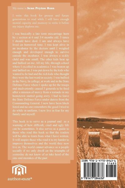 My name is Sean Peyton Ross. I write this book for present and future generations to read while I still have enough mental capacity and memory to write it before my injury depletes me. I was basically a late term miscarriage born by c section at 6 and 3/4 months old. 5 times I should have died. I am and always have lived on borrowed time. I was kept alive in an incubator by the doctors until I weighed enough and developed enough to survive outside the incubator. I was always a sickly child and was small. The other kids beat up and bullied on me. All my life, through school where I excelled in academics I was beaten up and bullied on. I was put down by the kids who wanted to be bad and the rich kids who thought they were the last word in society. I was bullied in the Navy, In college, at work and in the State Defense Force where I spoke up for the troops and inadvertently caused 3 generals to be fi red after a mission of mercy from a tornado in my hometown started going awry. I had to leave the State Defense Force under duress from the Commanding General. I now have been black listed and no one remembers the good I tried to do while in uniform. I now live in fear for my family and myself. This book is to serve as a journal and as a warning of how diffi cult, cruel and ugly life can be sometimes. It also serves as a guide to those who read this book so that the readers will be able to learn from what I have written. It will inspire those who read it to try harder to improve themselves and the world they now live in. The world cannot advance as a people socially if we only dwell on the triumphs of yesterday do not know of or take heed of the sins and mistakes of the past.