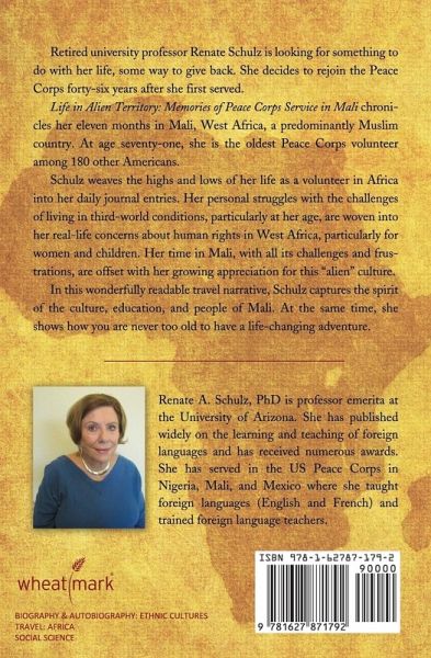 Retired university professor Renate Schulz is looking for something to do with her life, some way to give back. She decides to rejoin the Peace Corps forty-six years after she first served. Life in Alien Territory: Memories of Peace Corps Service in Mali chronicles her eleven months in Mali, West Africa, a predominantly Muslim country. At age seventy-one, she is the oldest Peace Corps volunteer among 180 other Americans. Schulz weaves the highs and lows of her life as a volunteer in Africa into her daily journal entries. Her personal struggles with the challenges of living in third-world conditions, particularly at her age, are woven into her real-life concerns about human rights in West Africa, particularly for women and children. Her time in Mali, with all its challenges and frustrations, are offset with her growing appreciation for this "alien" culture. In this wonderfully readable travel narrative, Schulz captures the spirit of the culture, education, and people of Mali. At the same time, she shows how you are never too old to have a life-changing adventure.