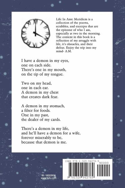 Ante Meridiem is a collection of my writing; poems, prose, excerpts, and loose pieces of my mind. This book documents my life in my favorite art form: words. -A.M
