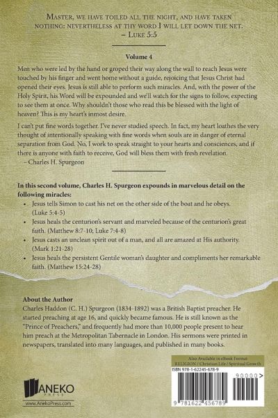 Master, we have toiled all the night, and have taken nothing: nevertheless at thy word I will let down the net. - Luke 5:5 Original title: Miracles and Parables of Our Lord. Volume 4 A deep, inspiring, and often challenging study of the Lord Jesus Christ's miracles and parables. Men who were led by the hand or groped their way along the wall to reach Jesus were touched by his finger and went home without a guide, rejoicing that Jesus Christ had opened their eyes. Jesus is still able to perform such miracles. And, with the power of the Holy Spirit, his Word will be expounded and we'll watch for the signs to follow, expecting to see them at once. Why shouldn't those who read this be blessed with the light of heaven? This is my heart's inmost desire. I can't put fine words together. I've never studied speech. In fact, my heart loathes the very thought of intentionally speaking with fine words when souls are in danger of eternal punishment. No, I work to speak straight to your hearts and consciences, and if there is anyone with faith to receive, God will bless them with fresh revelation. - Charles H. Spurgeon In this fourth volume, Charles H. Spurgeon expounds in marvelous detail on the following miracles:Jesus tells Simon to cast his net on the other side of the boat and he obeys. (Luke 5:4-5) Jesus heals the centurion's servant and marveled because of the centurion's great faith. (Matthew 8:7-10; Luke 7:4-8) Jesus casts an unclean spirit out of a man, and all are amazed at His authority. (Mark 1:21-28) Jesus heals the persistent Gentile woman's daughter and compliments her remarkable faith. (Matthew 15:24-28)