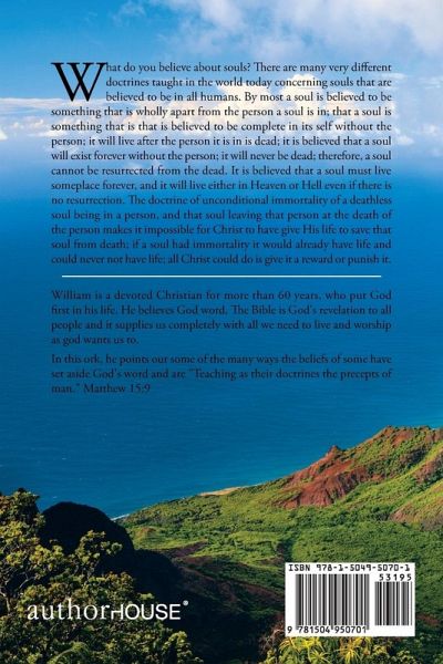 What do you believe about souls? There are many very different doctrines taught in the world today concerning souls that are believed to be in all humans. By most a soul is believed to be something that is wholly apart from the person a soul is in; that a soul is something that is that is believed to be complete in its self without the person; it will live after the person it is in is dead; it is believed that a soul will exist forever without the person; it will never be dead; therefore, a soul cannot be resurrected from the dead. It is believed that a soul must live someplace forever, and it will live either in Heaven or Hell even if there is no resurrection. The doctrine of unconditional immortality of a deathless soul being in a person, and that soul leaving that person at the death of the person makes it impossible for Christ to have give His life to save that soul from death; if a soul had immortality it would already have life and could never not have life; all Christ could do is give it a reward or punish it.