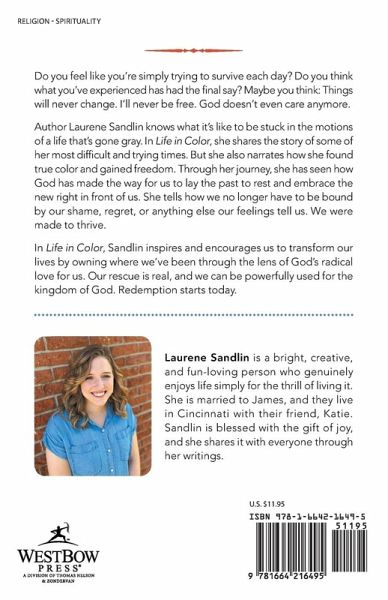 Do you feel like you're simply trying to survive each day? Do you think what you've experienced has had the final say? Maybe you think: Things will never change. I'll never be free. God doesn't even care anymore. Author Laurene Sandlin knows what it's like to be stuck in the motions of a life that's gone gray. In Life in Color, she shares the story of some of her most difficult and trying times. But she also narrates how she found true color and gained freedom. Through her journey, she has seen how God has made the way for us to lay the past to rest and embrace the new right in front of us. She tells how we no longer have to be bound by our shame, regret, or anything else our feelings tell us. We were made to thrive. In Life in Color, Sandlin inspires and encourages us to transform our lives by owning where we've been through the lens of God's radical love for us. Our rescue is real, and we can be powerfully used for the kingdom of God. Redemption starts today.