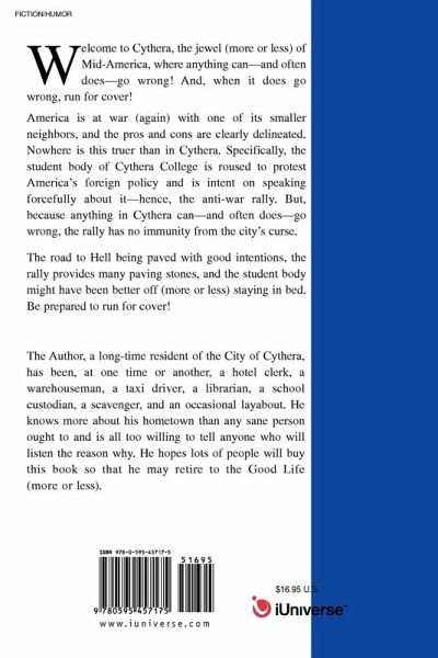 Welcome to Cythera, the jewel (more or less) of Mid-America, where anything can-and often does-go wrong! And, when it does go wrong, run for cover! America is at war (again) with one of its smaller neighbors, and the pros and cons are clearly delineated. Nowhere is this truer than in Cythera. Specifically, the student body of Cythera College is roused to protest America's foreign policy and is intent on speaking forcefully about it-hence, the anti-war rally. But, because anything in Cythera can-and often does-go wrong, the rally has no immunity from the city's curse. The road to Hell being paved with good intentions, the rally provides many paving stones, and the student body might have been better off (more or less) staying in bed. Be prepared to run for cover!