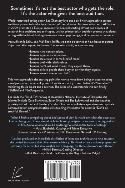 Demystify the audition process and land your dream role with this revolutionary book on acting! Actor, director, and world-renowned acting coach Les Chantery lays out an approach for the auditioning actor that has been heralded as "a revelation and unlike anything I've ever read on the topic of acting." (Matt Skrobalak, Former Senior Vice President of Casting CBS PARAMOUNT). A sure asset for any actor looking to land the part of their dreams. Life...In A Mid-Shot is the first book of its kind to blend acting with Neuroscience, Psychology and Behavioural Economics. Les Chantery's approach has helped actors book work on platforms including NETFLIX, HBO MAX, HULU, DISNEY+, MARVEL, PARAMOUNT + and more ! Foreword is written by one of Les Chantery's students, Jacob Elordi, described by GQ Magazine as "Gen Z's Leading Man" one of Hollywood's newest and brightest young stars after his performance on HBO's hit show EUPHORIA. A Professor of Acting at the prestigious National Institute of Dramatic Art, and former actor featured alongside multiple high-profile actors, including Vin Diesel, Al Pacino, and Robert De Niro. Les Chantery's "Life...In A Mid-Shot" is a principle manual for mastering the screen audition : ¿ Practical Hacks to Crack the Audition Room ¿ How to Own the Room ¿ The Science of Acting to Camera ¿ Tools to Fill Your Acting Toolbox ¿ Brain Hacks to Step Up Your Game ¿ Anecdotes and Insights from Two Decades of Working with Hollywood A-List Actors! Actors can now source privileged content tried & tested by the Top 2% of Actors in Hollywood. Landing that Film or TV role is only one book away.