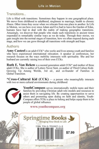 Life is filled with transitions. Sometimes they happen in one geographical place. We move from childhood to adulthood, singleness to marriage, health to chronic illness. Other times they occur when we relocate from one place to another. In Life in Motion, we see how ever since Adam and Eve had to leave the Garden of Eden, humans have had to deal with the reality of making geographic transitions. Amazingly, we discover that people who made such transitions in ancient times responded in remarkably similar ways as we do today. Through their stories, we gain insight into the normal stages of transition, how we often respond during each stage, and how we can grow through all transitions with strength and hope.