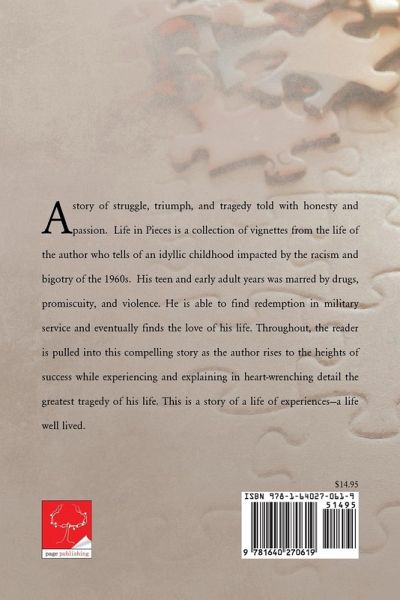 A story of struggle, triumph, and tragedy told with honesty and passion. Life in Pieces is a collection of vignettes from the life of the author who tells of an idyllic childhood impacted by the racism and bigotry of the 1960s. His teen and early adult years was marred by drugs, promiscuity, and violence. He is able to find redemption in military service and eventually finds the love of his life. Throughout, the reader is pulled into this compelling story as the author rises to the heights of success while experiencing and explaining in heart-wrenching detail the greatest tragedy of his life. This is a story of a life of experiencesa life well lived.