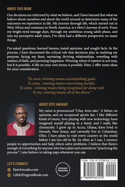 Our decisions are informed by what we believe, I have learned. What we believe about ourselves and about the world around us determine many of the outcomes we experience in life. My journey through life, which started out in West Africa and continues in North America, is a Hero's Journey of sorts. From my bright-eyed teenage days, through my ambitious young adult phase, and into my naive adult years, I’ve often had a different perspective on many things. I’ve asked questions and learned lessons; tested opinions and sought facts. In the process, I discovered the critical role that decisions play in realizing my purpose, facing my fears, nurturing thriving relationships, wrestling with matters of faith, and pursuing happiness. Winning where it matters is not easy, but it is possible. A life on your own terms is possible. Here, I offer some ideas for your consideration. TABLE OF CONTENTS 1. Myself 2. Happy Are We 3. Hello, World! 4. Preparing for Take Off 5. Welcome to America 6. The Pursuit of Happiness 7. Clarity of Purpose 8. Work and Happiness 9. Felt The Fear But Did It Anyway 10. Self-Awareness and Personal Power 11. What Matters Most 12. This I Believe 13. Making Sense of God 14. My Obituary 15. My Playlist 16. What’s Love Got to Do With it? 17. Love and Marriage 18. My Brother’s Keeper 19. My Daughter In Whom I’m Well Pleased 21. All I Do Is Win 22. My Appreciation