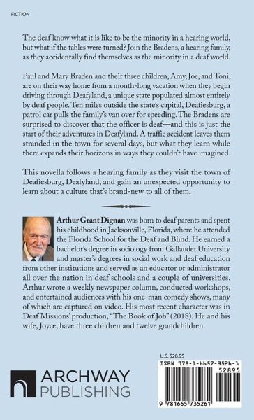 The deaf know what it is like to be the minority in a hearing world, but what if the tables were turned? Join the Bradens, a hearing family, as they accidentally find themselves as the minority in a deaf world. Paul and Mary Braden and their three children, Amy, Joe, and Toni, are on their way home from a month-long vacation when they begin driving through Deafyland, a unique state populated almost entirely by deaf people. Ten miles outside the state's capital, Deafiesburg, a patrol car pulls the family's van over for speeding. The Bradens are surprised to discover that the officer is deaf-and this is just the start of their adventures in Deafyland. A traffic accident leaves them stranded in the town for several days, but what they learn while there expands their horizons in ways they couldn't have imagined. This novella follows a hearing family as they visit the town of Deafiesburg, Deafyland, and gain an unexpected opportunity to learn about a culture that's brand-new to all of them.