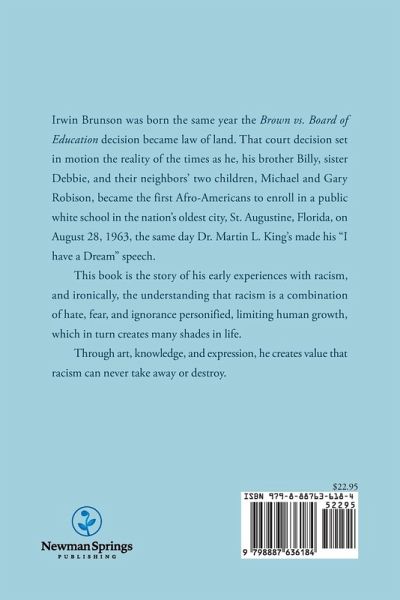 Irwin Brunson was born the same year the Brown vs. Board of Education decision became law of land. That court decision set in motion the reality of the times as he, his brother Billy, sister Debbie, and their neighbors' two children, Michael and Gary Robison, became the first Afro-Americans to enroll in a public white school in the nation's oldest city, St. Augustine, Florida, on August 28, 1963, the same day Dr. Martin L. King's made his "I have a Dream" speech. This book is the story of his early experiences with racism, and ironically, the understanding that racism is a combination of hate, fear, and ignorance personified, limiting human growth, which in turn creates many shades in life. Through art, knowledge, and expression, he creates value that racism can never take away or destroy.