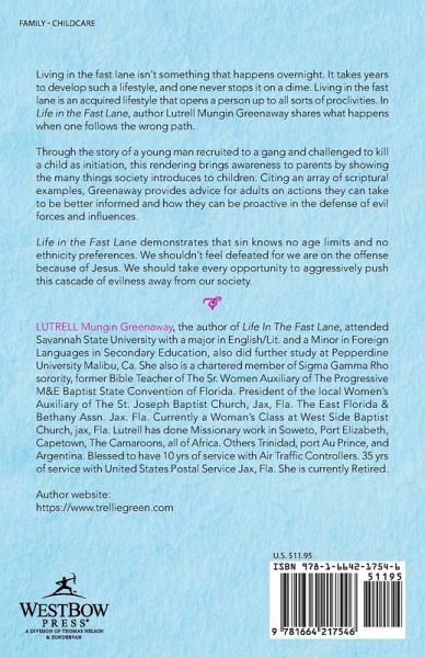 Living in the fast lane isn't something that happens overnight. It takes years to develop such a lifestyle, and one never stops it on a dime. Living in the fast lane is an acquired lifestyle that opens a person up to all sorts of proclivities. In Life in the Fast Lane, author Lutrell Mungin Greenaway shares what happens when one follows the wrong path. Through the story of a young man recruited to a gang and challenged to kill a child as initiation, this rendering brings awareness to parents by showing the many things society introduces to children. Citing an array of scriptural examples, Greenaway provides advice for adults on actions they can take to be better informed and how they can be proactive in the defense of evil forces and influences. Life in the Fast Lane demonstrates that sin knows no age limits and no ethnicity preferences. We shouldn't feel defeated for we are on the offense because of Jesus. We should take every opportunity to aggressively push this cascade of evilness away from our society.