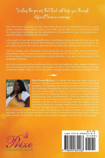 Life In The Hood is a gripping true story that follows the journey of Carla Person-McCray, a young woman navigating the tumultuous waters of love, faith, and self-discovery. Torn between her desire for a meaningful relationship and her commitment to a life devoted to God, Carla embarks on a path that leads to heartache and revelation.In her quest for love, she dives headfirst into a relationship, hoping to make him love her as she truly deserves. Yet, as the layers of their connection unfold, she comes to a painful realization-he isn't ready to give her the love she deserves, and the battles she's fighting may not be hers to win.With raw honesty and vulnerability, Carla shares how her dreams collide with harsh realities, culminating in a fiery explosion of emotions that reshapes her life. The title, Life In The Hood, plays on the surname of the man who becomes a pivotal character in her story-and a symbol of the challenges she faces.Join Carla as she unravels the complexities of love, faith, and resilience, inviting readers to reflect on their own journeys. So, sit back, relax, and immerse yourself in Life In The Hood, where every page reveals the strength it takes to rise from the ashes of disappointment and embrace a brighter future.