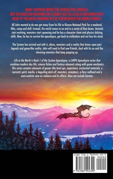 All John wanted to do was get away from his life in Kluane National Park for a weekend. Hike, camp and chill. Instead, the world comes to an end in a series of blue boxes. Animals start evolving, monsters start spawning and he has a character sheet and physics defying skills. Now, he has to survive the apocalypse, get back to civilisation and not lose his mind. The System has arrived and with it, aliens, monsters and a reality that draws upon past legends and game-like reality. John will need to find new friends, deal with his ex and the slavering monsters that keep popping up. This book is the Large Print Edition of Life in the North is Book 1 of the System Apocalypse, a LitRPG Apocalypse series that combines modern day life, science fiction and fantasy elements along with game mechanics.