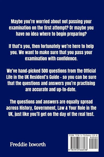 What the students who pass the Life in the UK Test on their first attempt know, that you don't... Maybe you're worried about not passing your examination on the first attempt? Or maybe you have no idea where to begin with preparing for the test? If that's you, then fortunately we're here to help you. We want to make sure that you pass your examination with confidence. We've hand-picked 500 questions for 2023 so you can be sure that the questions and answers you're practising are accurate and up-to-date. The questions and answers are equally spread across History, Government, Law & Your Role in the UK. We've included a mix of multiple choice questions and true/false questions, just like you'll get on the day of the real test. Here's what you'll get inside this book: 500 Practice Questions Detailed answers at the back of the book Important information on how & where to book your test Revision lists of sports personalities Revision lists of cultural personalities and inventors *BONUS* - We've also included detailed lists of every King & Queen at the back of the book, to help you recall exactly when each Monarch was in power. No matter where in the world you are from, this book will help you to pass your Life in the UK test faster, and with more confidence - on your first attempt. If you want to become a happy & fulfilled resident or citizen of the UK and pass the examination faster, then.