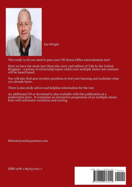 A copy of the necessary text of Life In The United Kingdom - a journey to citizenship, 2nd edition 2007 PLUS revision questions and answers to confirm your learning. There is also a study guide and helpline information Everything you need to pass your UK naturalisation test first time! For just £3, an Interactive CD/download programme is also available to accompany this book from lifetests@mail2question.com