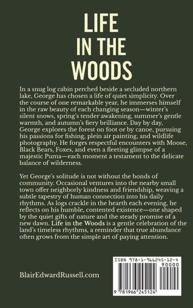 In a snug log cabin perched beside a secluded northern lake, George has chosen a life of quiet simplicity. Over the course of one remarkable year, he immerses himself in the raw beauty of each changing season-winter's silent snows, spring's tender awakening, summer's gentle warmth, and autumn's fiery brilliance. Day by day, George explores the forest on foot or by canoe, pursuing his passions for fishing, plein air painting, and wildlife photography. He forges respectful encounters with Moose, Black Bears, Foxes, and even a fleeting glimpse of a majestic Puma-each moment a testament to the delicate balance of wilderness. Yet George's solitude is not without the bonds of community. Occasional ventures into the nearby small town offer neighborly kindness and friendship, weaving a subtle tapestry of human connection into his daily rhythms. As logs crackle in the hearth each evening, he reflects on his humble, contented existence-one shaped by the quiet gifts of nature and the steady promise of a new dawn. Life in the Woods is a gentle celebration of the land's timeless rhythms, a reminder that true abundance often grows from the simple art of paying attention.