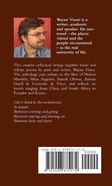Now in its 2nd edition, this creative collection brings together travel and tribute poems by South African poet and writer, Wayne Visser. The anthology pays tribute to the likes of Nelson Mandela, Maya Angelou, Barack Obama, Antoni Gaudí & Leonardo da Vinci, and reflects on travels ranging from China and South Africa to Ecuador and Russia. Life is lived in the in-between In transit Between coming and going Between staying and moving on Between here and there