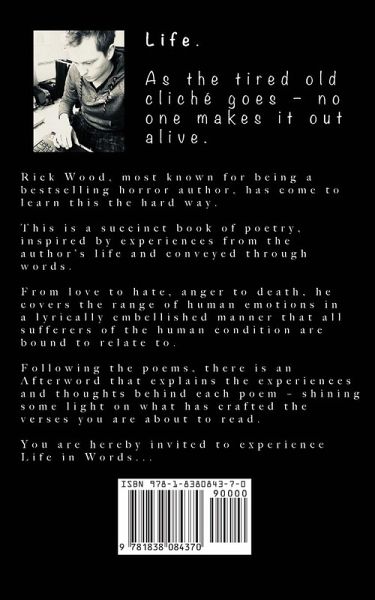 Life.As the tired old cliché goes - no one makes it out alive.Rick Wood, most known for being a bestselling horror author, has come to learn this the hard way.This is a succinct book of poetry, inspired by experiences from the author's life and conveyed through words. From love to hate, anger to death, he covers the range of human emotions in a lyrically embellished manner that all sufferers of the human condition are bound to relate to.Following the poems, there is an Afterword that explains the experiences and thoughts behind each poem - shining some light on what has crafted the verses you are about to read.You are hereby invited to experience Life in Words.