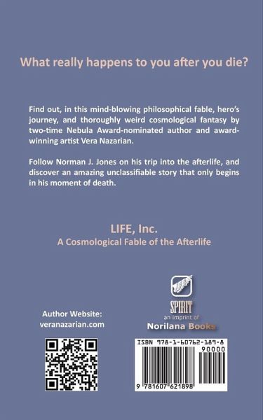 What really happens to you after you die? Find out, in this mind-blowing philosophical fable, hero's journey, and thoroughly weird cosmological fantasy by two-time Nebula Award-nominated author and award-winning artist Vera Nazarian. Follow Norman J. Jones on his trip into the afterlife, and discover an amazing unclassifiable story that only begins in his moment of death. LIFE, Inc. A Cosmological Fable of the Afterlife