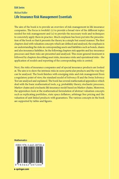 The aim of the book is to provide an overview of risk management in life insurance companies. The focus is twofold: (1) to provide a broad view of the different topics needed for risk management and (2) to provide the necessary tools and techniques to concretely apply them in practice. Much emphasis has been put into the presentation of the book so that it presents the theory in a simple but sound manner. The first chapters deal with valuation concepts which are defined and analysed, the emphasis is on understanding the risks in corresponding assets and liabilities such as bonds, shares and also insurance liabilities. In the following chapters risk appetite and key insurance processes and their risks are presented and analysed. This more general treatment is followed by chapters describing asset risks, insurance risks and operational risks - the application of models and reporting of the corresponding risks is central. Next, the risks of insurance companies and of special insurance products are looked at. The aim is to show the intrinsic risks in some particular products and the way they can be analysed. The book finishes with emerging risks and risk management from a regulatory point of view, the standard model of Solvency II and the Swiss Solvency Test are analysed and explained. The book has several mathematical appendices which deal with the basic mathematical tools, e.g. probability theory, stochastic processes, Markov chains and a stochastic life insurance model based on Markov chains. Moreover, the appendices look at the mathematical formulation of abstract valuation concepts such as replicating portfolios, state space deflators, arbitrage free pricing and the valuation of unit linked products with guarantees. The various concepts in the book are supported by tables and figures.