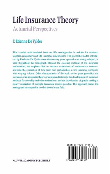 This book is different from all other books on Life Insurance by at least one of the following characteristics 1-4. 1. The treatment of life insurances at three different levels: time-capital, present value and price level. We call time-capital any distribution of a capital over time: (_) is the time-capital with amounts Cl, ~, ... , C at moments Tl, T , ..- , T resp. N 2 N For instance, let (x) be a life at instant 0 with future lifetime X. Then the whole oO oO life insurance A is the time-capital (I,X). The whole life annuity ä is the x x time-capital (1,0) + (1,1) + (1,2) + ... + (I,'X), where 'X is the integer part ofX. The present value at 0 of time-capital (_) is the random variable T1 T TN Cl V + ~ v , + ... + CNV . (__) In particular, the present value ofA 00 and ä 00 is x x 0 0 2 A = ~ and ä = 1 + v + v + ... + v'X resp. x x The price (or premium) of a time-capital is the expectation of its present value. In particular, the price ofA 00 and äx 00 is x 2 A = E(~) and ä = E(I + v + v + ... + v'X) resp.
