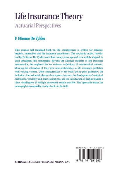 This book is different from all other books on Life Insurance by at least one of the following characteristics 1-4. 1. The treatment of life insurances at three different levels: time-capital, present value and price level. We call time-capital any distribution of a capital over time: (_) is the time-capital with amounts Cl, ~, ... , C at moments Tl, T , ..- , T resp. N 2 N For instance, let (x) be a life at instant 0 with future lifetime X. Then the whole oO oO life insurance A is the time-capital (I,X). The whole life annuity ä is the x x time-capital (1,0) + (1,1) + (1,2) + ... + (I,'X), where 'X is the integer part ofX. The present value at 0 of time-capital (_) is the random variable T1 T TN Cl V + ~ v , + ... + CNV . (__) In particular, the present value ofA 00 and ä 00 is x x 0 0 2 A = ~ and ä = 1 + v + v + ... + v'X resp. x x The price (or premium) of a time-capital is the expectation of its present value. In particular, the price ofA 00 and äx 00 is x 2 A = E(~) and ä = E(I + v + v + ... + v'X) resp.