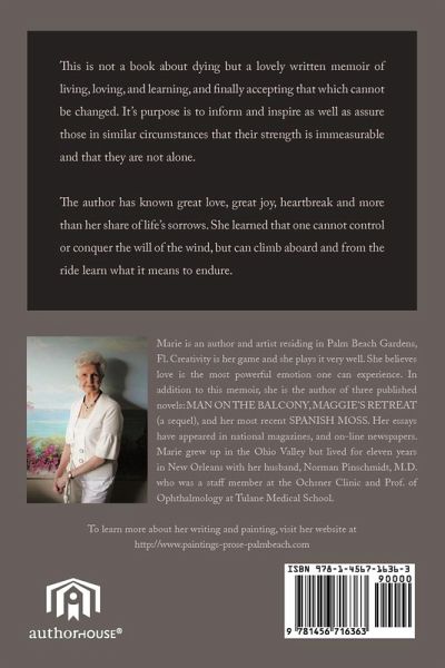 This is not a book about dying but a lovely written memoir of living, loving, and learning, and finally accepting that which cannot be changed. It's purpose is to inform and inspire as well as assure those in similar circumstances that their strength is immeasurable and that they are not alone. The author has known great love, great joy, heartbreak and more than her share of life's sorrows. She learned that one cannot control or conquer the will of the wind, but can climb aboard and from the ride learn what it means to endure.