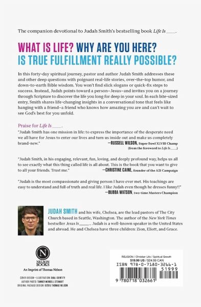 What is life? What are we here for? What will bring us true satisfaction and lasting happiness? In this companion to Life Is ___, New York Times and USA Today best-selling author Judah Smith takes readers on a forty-day devotional journey through Scripture to find the answers to these and others of our deepest questions. In forty daily readings, Judah helps readers understand that the meaning of life is found in loving and being loved, in enjoying God to the fullest, in trusting Him in every moment, and remaining at peace with God, others, and ourselves. This thought-provoking and inspiring collection of meditations is sure to reveal new and illuminating truths about what God intends for every person's life.