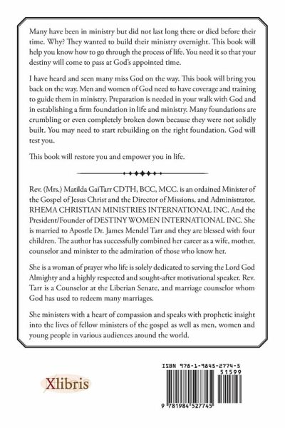 Many have been in ministry but did not last long there or died before their time. Why? They wanted to build their ministry overnight. This book will help you know how to go through the process of life. You need it so that your destiny will come to pass at Gods appointed time. I have heard and seen many miss God on the way. This book will bring you back on the way. Men and women of God need to have coverage and training to guide them in ministry. Preparation is needed in your walk with God and in establishing a firm foundation in life and ministry. Many foundations are crumbling or even completely broken down because they were not solidly built. You may need to start rebuilding on the right foundation. God will test you. This book will restore you and empower you in life.