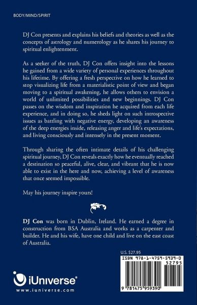 DJ Con presents and explains his beliefs and theories as well as the concepts of astrology and numerology as he shares his journey to spiritual enlightenment. As a seeker of the truth, DJ Con offers insight into the lessons he gained from a wide variety of personal experiences throughout his lifetime. By offering a fresh perspective on how he learned to stop visualizing life from a materialistic point of view and began moving to a spiritual awakening, he allows others to envision a world of unlimited possibilities and new beginnings. DJ Con passes on the wisdom and inspiration he acquired from each life experience, and in doing so, he sheds light on such introspective issues as battling with negative energy, developing an awareness of the deep energies inside, releasing anger and life's expectations, and living consciously and intensely in the present moment. Through sharing the often intimate details of his challenging spiritual journey, DJ Con reveals exactly how he eventually reached a destination so peaceful, alive, clear, and vibrant that he is now able to exist in the here and now, achieving a level of awareness that once seemed impossible. May his journey inspire yours!