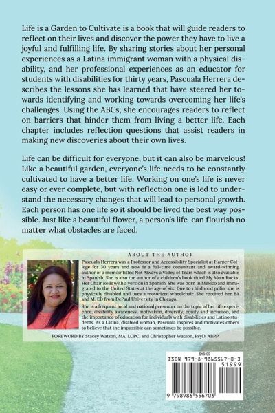 Life is a Garden to Cultivate is a book that will guide readers to reflect on their lives and discover the power they have to live a joyful and fulfilling life. By sharing stories about her personal experiences as a Latina immigrant woman with a physical disability, and her professional experiences as an educator for students with disabilities for thirty years, Pascuala Herrera describes the lessons she has learned that have steered her towards identifying and working towards overcoming her life's challenges. Using the ABCs, she encourages readers to reflect on barriers that hinder them from living a better life. Each chapter includes reflection questions that assist readers in making new discoveries about their own lives. Life can be difficult for everyone, but it can also be marvelous! Like a beautiful garden, everyone's life needs to be constantly cultivated to have a better life. Working on our lives is never easy or ever complete, but with reflection one is led to understand the necessary changes that will lead to personal growth. Each person has one life so it should be lived the best way possible. Just like a beautiful flower, a person's life can flourish no matter what obstacles are faced.