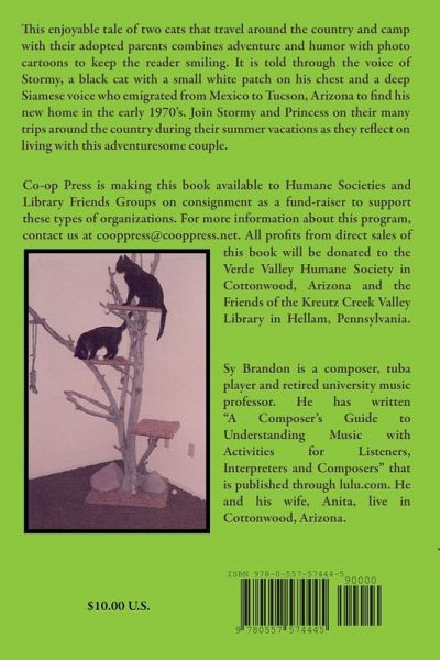 This enjoyable tale of two cats that travel around the country and camp with their adopted parents combines adventure and humor with photo cartoons to keep the reader smiling. It is told through the voice of Stormy, a black cat with a small white patch on his chest and a deep Siamese voice. Join Stormy and Princess on their many trips around the country during their summer vacations as they reflect on living with this adventuresome couple. Co-op Press is making this book available to Humane Societies and Library Friends Groups on consignment as a fund-raiser to support these types of organizations. For more information about this program, contact us at cooppress@cooppress.net. All profits from direct sales of this book will be donated to the Verde Valley Humane Society in Cottonwood, Arizona and the Friends of the Kreutz Creek Valley Library in Hellam, Pennsylvania.