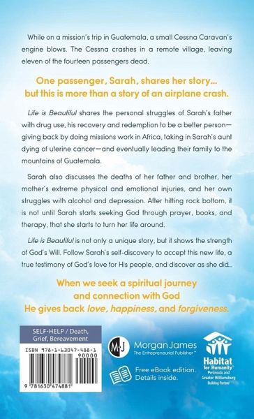 "Life is Beautiful: How a Lost Girl Became a True, Confident Child of God" takes you on a full journey of trauma, loss, and finally resilience. While on a mission's trip in Guatemala, a small Cessna Caravan's engine blows while carrying fourteen passengers. Unfortunately, the Cessna crashes in a remote village, leaving eleven of the fourteen passengers dead. One passenger, Sarah, shares her story in "Life is Beautiful", about the deaths of her father and brother; her mother's extreme physical and emotional injuries, and Sarah's self-discovery to accept this new life. "Life is Beautiful", however, is more than a story about an airplane crash. "Life is Beautiful" shares the personal struggles of Sarah's father's drug use, his recovery, and redemption to be a better person. He gives back by doing missions work in Africa, takes in Sarah's aunt dying of uterine cancer, and eventually leads their family to the mountains of Guatemala. Sarah also discusses her struggles with alcohol use and depression; where she eventually hits rock bottom. It is not until she starts seeking God through prayer, books, and therapy, where she starts to turn her life around. "Life is Beautiful" is not only a unique story, but it shows the strength of God's Will. When all hope is lost, she never gives up on God. This story is a true testimony of God's love for His people, and when one seeks a spiritual journey and connection with God; He gives back in love, forgiveness, and happiness.