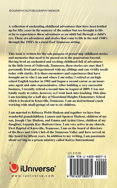 A collection of enchanting childhood adventures that have been bottled up for fifty years in the memory of the author but are brought to life as he re-experiences these adventures as an adult but through a child's eye. These are adventures and stories that come to life in the mid 1940's through the 1950's in a rural East Tennessee setting.
