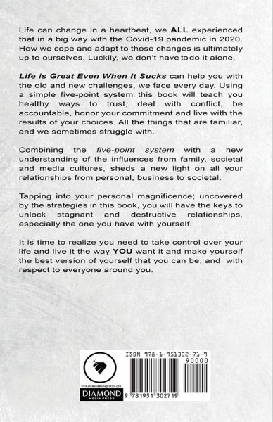 Life can change in a heartbeat. We ALL experienced that in a big way with the Covid-19 pandemic in 2020. How we cope and adapt to those changes is ultimately up to ourselves. Luckily, we don't have to do it alone. Life is Great Even When It Sucks can help you with the old and new challenges, we face every day. Using a simple five-point system this book will teach you healthy ways to trust, deal with conflict, be accountable, honor your commitment and live with the results of your choices. All the things that are familiar, and we sometimes struggle with. Combining the five-point system with a new understanding of the influences from family, societal and media cultures, sheds a new light on all your relationships from personal, business to societal. Tapping into your personal magnificence; uncovered by the strategies in this book, you will have the keys to unlock stagnant and destructive relationships, especially the one you have with yourself. It is time to realize you need to take control over your life and live it the way YOU want it and make yourself the best version of yourself that you can be, and with respect to everyone around you.