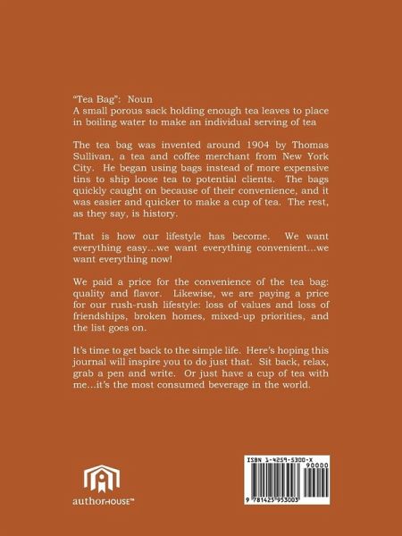 "Tea Bag": Noun A small porous sack holding enough tea leaves to place in boiling water to make an individual serving of tea The tea bag was invented around 1904 by Thomas Sullivan, a tea and coffee merchant from New York City. He began using bags instead of more expensive tins to ship loose tea to potential clients. The bags quickly caught on because of their convenience, and it was easier and quicker to make a cup of tea. The rest, as they say, is history. That is how our lifestyle has become. We want everything easy.we want everything convenient.we want everything now! We paid a price for the convenience of the tea bag: quality and flavor. Likewise, we are paying a price for our rush-rush lifestyle: loss of values and loss of friendships, broken homes, mixed-up priorities, and the list goes on. It's time to get back to the simple life. Here's hoping this journal will inspire you to do just that. Sit back, relax, grab a pen and write. Or just have a cup of tea with me.it's the most consumed beverage in the world.