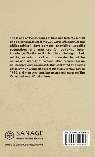 This is one of the few series of talks and lectures as well as a personal account of the G. I. Gurdjieff's spiritual and philosophical development providing specific suggestions and practices for achieving inner knowledge. The first section is mainly autobiographical, relating material crucial to an understanding of the nature and intensity of personal effort required for an all-inclusive work on oneself. This is followed by a series of talks which Gurdjieff gave to his pupils in New York in 1930, and then by a long, but incomplete, essay on 'The Outer and Inner World of Man'.