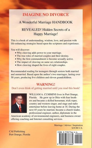 Number one marriage handbook. Men simply DO NOT understand marriage or the true roles of married couples and their destiny! This book is one of the best (and cheapest) ways to discover the secrets of a happy lifelong marriage. A page turner, it deals with the current dilemmas of cohabitation, divorce, abortion, gay lifestyle, and same sex marriage. By unraveling the hidden secrets of cleaving it adds power to any marriage. Revealed are seven key words that can stop divorce in its tracks and nail the door shut on abortion and same sex marriage. This is a book of understanding, wisdom, love, and passion with life enhancing strategies based upon the scriptures. It includes many of the author's life experiences as a cowboy, engineer, and business man during two marriages lasting over 60 years producing five children, 11 grandchildren, and 3 great grandchildren. A MUST READ book before any man or woman even thinks of getting married.