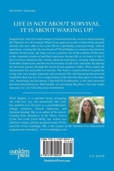 Imagine how your life would change if you discovered the secrets to understanding the Natural Laws of Creation? What if you could access the wisdom of the ancients directly and were able to live your life as a spiritually awakened being, with an open heart, creating the life you dream of? Wind Hughes is a modern-day feminine shaman. In this book, she takes you on a journey out of the confines of the body to the expanded reaches of spiritual experience beyond life as we know it. Life Is the Ceremony chronicles her visions, mystical experiences, meeting with teachers from other dimensions, and her use of ceremony to call in her soul mate. By sharing her personal journey through the mystical and quantum realms, Wind makes the transcendent life accessible to everyone. This book is a practical how-to guide for living your own unique conscious and awakened life, and becoming the powerful manifestor that you are. It is a map leading to the doorway that opens to the other side. Awakening and becoming a Spiritual R-Evolutionary is the most powerful personal and political act. Individually, we can change the planet. You may laugh, you may cry: you will come away transformed. In Life Is the Ceremony, Wind interweaves her professional life as a psychotherapist into her spiritual experience and mystical visions, providing the reader an intimate insight into our human journey and our desire for a deeper understanding of life. Wind's candid style of writing is evident in her award-winning first book, Daughters of the Moon, Sisters of the Sun: Young Women and Mentors on the Transition to Womanhood (co-authored with Linda Wolf, available from New Society Publishers). The book, which has been translated into Chinese, is based on a two-year project for teens designed to empower young women and facilitate healthy relationships between the genders. Those who shared their wisdom include Maya Angelou, the Indigo Girls, Riane Eisler, Angela Davis, Starhawk, Robert Bly, and many others. Win