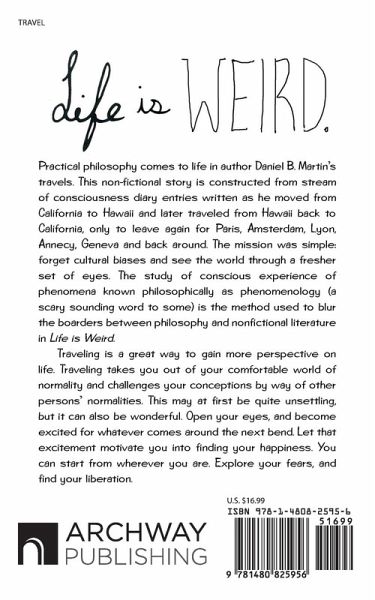 " Practical philosophy comes to life in author Daniel B. Martin¿s travels. This non-fictional story is constructed from stream of consciousness diary entries written as he moved from California to Hawaii and later traveled from Hawaii back to California, only to leave again for Paris, Amsterdam, Lyon, Annecy, Geneva and back around. The mission was simple: forget cultural biases and see the world through a fresher set of eyes. The study of conscious experience of phenomena known philosophically as phenomenology (a scary sounding word to some) is the method used to blur the borders between philosophy and nonfictional literature in Life is Weird. Traveling is a great way to gain more perspective on life. Traveling takes you out of your comfortable world of normality and challenges your conceptions by way of other persons¿ normalities. This may at first be quite unsettling, but it can also be wonderful. Open your eyes, and become excited for whatever comes around the next bend. Let that excitement motivate you into finding your happiness. You can start from wherever you are. Explore your fears, and find your liberation."