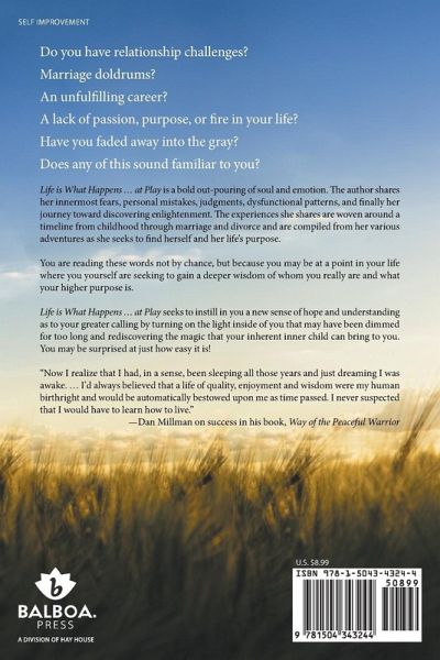 Do you have relationship challenges? Marriage doldrums? An unfulfilling career? A lack of passion, purpose, or fire in your life? Have you faded away into the gray? Does any of this sound familiar to you? Life is What Happens ... at Play is a bold out-pouring of soul and emotion. The author shares her innermost fears, personal mistakes, judgments, dysfunctional patterns, and finally her journey toward discovering enlightenment. The experiences she shares are woven around a timeline from childhood through marriage and divorce and are compiled from her various adventures as she seeks to find herself and her life's purpose. You are reading these words not by chance, but because you may be at a point in your life where you yourself are seeking to gain a deeper wisdom of whom you really are and what your higher purpose is. Life is What Happens ... at Play seeks to instill in you a new sense of hope and understanding as to your greater calling by turning on the light inside of you that may have been dimmed for too long and rediscovering the magic that your inherent inner child can bring to you. You may be surprised at just how easy it is! "Now I realize that I had, in a sense, been sleeping all those years and just dreaming I was awake. ... I'd always believed that a life of quality, enjoyment and wisdom were my human birthright and would be automatically bestowed upon me as time passed. I never suspected that I would have to learn how to live." -Dan Millman on success in his book, Way of the Peaceful Warrior
