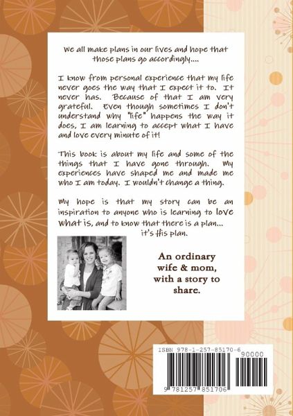 We all make plans in our lives and hope that those plans go accordingly.... I know from personal experience that my life never goes the way that I expect it to. It never has. Because of that I am very grateful. Even though sometimes I don't understand why ""life"" happens the way it does, I am learning to accept what I have and love every minute of it! This book is about my life and some of the things that I have gone through. My experiences have shaped me and made me who I am today. I wouldn't change a thing. My hope is that my story can be an inspiration to anyone who is learning to love what is, and to know that there is a plan... it's His plan. An ordinary wife & mom, with a story to share.