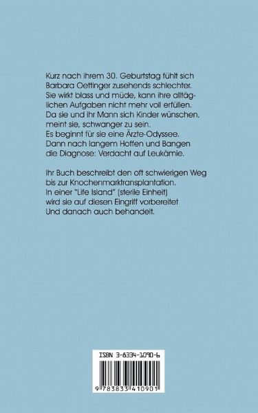 Kurz nach ihrem 30. Geburtstag fühlt sich Barbara Oettinger körperlich zusehends schlechter. Sie wirkt blass und müde, kann ihre alltäglichen Aufgaben nicht mehr voll erfüllen. Da sie und ihr Mann sich Kinder wünschen, glaubt sie schwanger zu sein. Es beginnt für sie eine Ärzte-Odyssee. Dann nach langem Hoffen und Bangen die Diagnose: Verdacht auf Leukämie. Ihr Buch beschreibt den oft schwierigen Weg bis zur Knochenmarktransplantation. In einer der "Life Island" (=sterile Einheit) wird sie auf diesen Eingriff vorbereitet und danach auch behandelt. Eine Krankenschwester definierte den Begriff recht treffend, indem sie erklärte, man nenne das "Lebens-Insel" (wörtlich übersetzt), weil man danach "reif für die Insel" sei.