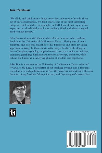 "We all do and think funny things every day, only most of us edit them out of our consciousness, we don't share some of the most interesting things we think and do. For example, in 1981 I heard that my wife was expecting our third child, and I was suddenly filled with the archetypal need to make money." John Boe continues with the anecdote of how he came to be teaching English at the University of California at Davis, offering one of many delightful and personal snapshots of his humorous and often revealing approach to living. In these short, witty essays, he slices life along the lines of Jungian psychology applied to such everyday topics as holidays, palmistry, Shakespeare, movies, astrology, and more, while behind the humor is a satisfying glimpse of wisdom and experience. John Boe is a lecturer at the University of California at Davis, editor of Writing on the Edge, a newsletter about teaching writing, and a frequent contributor to such publications as East Bay Express, Unte Reader, the San Francisco Jung Institute Library Journal, and Psychological Perspectives. Table of Contents Part 1: Looking for the Meaning of Life Messiness Is Next to Goddessness Mistakes Were Made: Philosophy in an Off Key For Me and My Anima Religion and Basketball The Holidays of Darkness In the Palm of My Hand Don't Dream It, Be It: The Rocky Horror Picture Show as Dionysian Revel Marie-Louise von Franz and The Way of the Dream Pleasing and Agreeable: An Interview with John Freeman The Age of Pegasus Part II: Looking at Literature The Wolf in Jack London Simenon, Apollo, and Dionysus: A Jungian Approach to Mysteries To Kill Mercutio: Thoughts on Shakespeare's Psychological Development The Introvert in Shakespeare Cats and Dogs: A Theory of Literature Part III: Looking at Life Itself On My Back Papa Was a Gamblin' Man A Time to Be Born Notes: My Mother at the Piano Life Itself