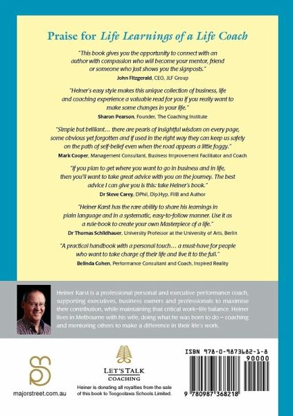 Elite sports people and business executives have coaches to help them perform at the highest level. The majority of coaches have themselves been leading athletes or top business people. The guidance and wisdom they impart fast-tracks the careers of those they work with. If coaching works in sport and in business - why not in everyday life? Author, Heiner Karst has spent many years coaching and mentoring clients to become the best they can be. He believes that with the right insights, many of us can coach ourselves through the obstacles we encounter, and develop a bunch of really strong, success-generating habits. The tools and approaches mapped out in this book can fast-track readers to desirable outcomes. We all face obstacles along our path, many of which are self-made. Life Learnings of a Life Coach will help us recognise them and the unconscious patterns we play out in our daily lives. With the structured guidance contained in this fascinating new book we can set about removing these obstacles and replacing them so that we can begin to live the life we have always wanted. The concepts outlined in Life Learnings of a Life Coach are a combination of universal truths, a lifetime of study and personal development, reading and learning. The book comprises 52 short chapters and is divided into five parts: 1. Let's start with you 2. Stretching your goals 3. What makes us happy? 4. There but for me, go I 5. Raising your game. Praise for Life Learnings of a Life Coach: "This book gives you the opportunity to connect with an author with compassion who will become your mentor, friend or someone who just shows you the signposts." - John Fitzgerald, CEO, JLF Group "Heiner's easy style makes this unique collection of business, life and coaching experience a valuable read for you if you really want to make some changes in your life." - Sharon Pearson, Founder, The Coaching Institute "Simple but brilliant... there are pearls of insightful wisdom on every page, some obvious yet forgotten and if used in the right way they can keep us safely on the path of self-belief even when the road appears a little foggy." - Mark Cooper, Management Consultant, Business Improvement Facilitator and Coach "If you plan to get where you want to go in business and in life, then you'll want to take great advice with you on the journey. The best advice I can give you is this: take Heiner's book." - Dr Steve Carey, DPhil, Dip.Hyp, FIIB and Author "Heiner Karst has the rare ability to share his learnings in plain language and in a systematic, easy-to-follow manner. Use it as a rule-book to create your own Masterpiece of a life." - Dr Thomas Schildhauer, University Professor at the University of Arts, Berlin "A practical handbook with a personal touch - a must-have for people who want to take charge of their life and live it to the full." - Belinda Cohen, Performance Consultant and Coach, Inspired Reality